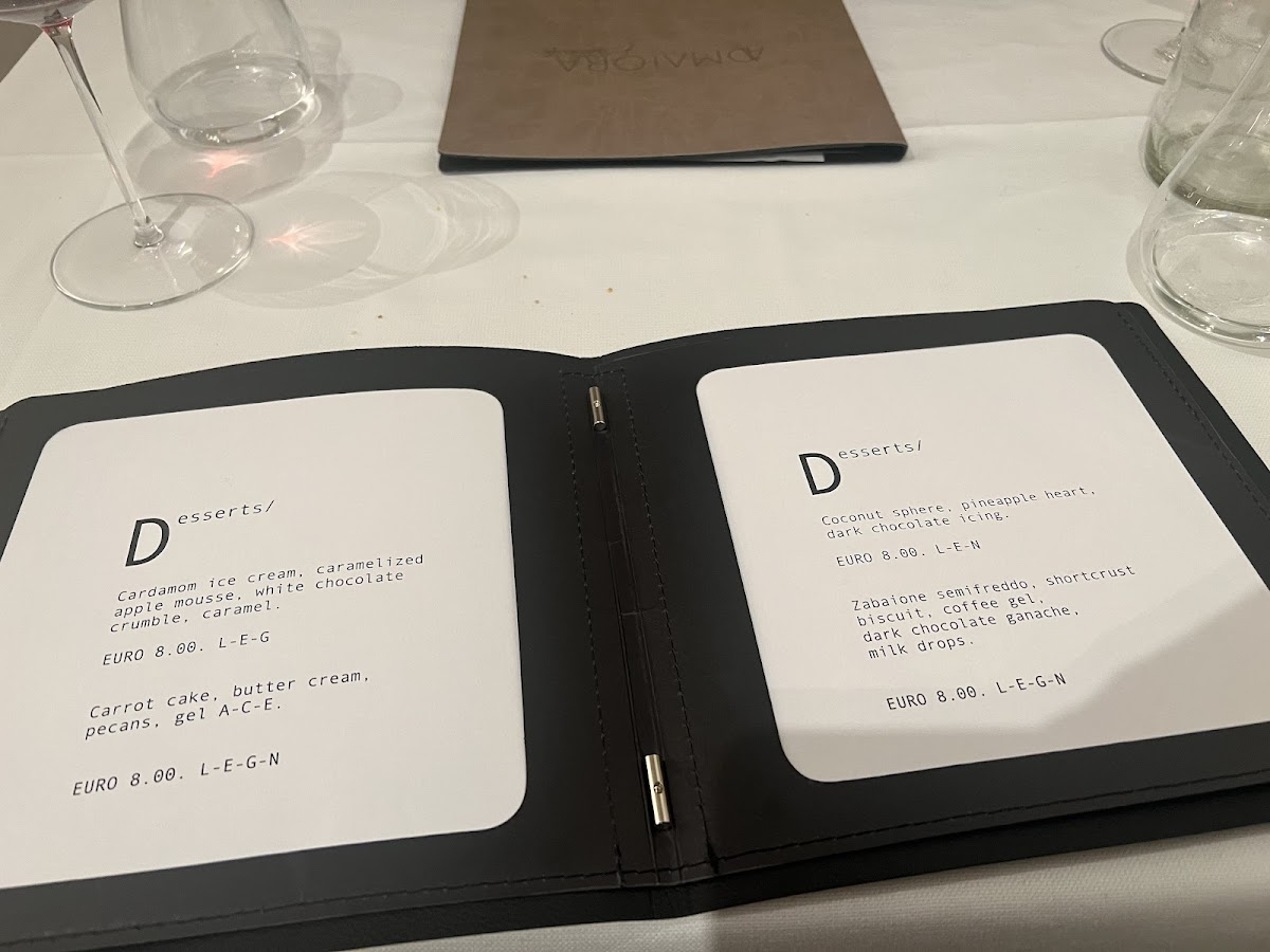The menu features a thoughtfully crafted tasting experience, showcasing fresh ingredients and innovative combinations. Highlights include exquisite scallops paired with pancetta and a unique squid noodle dish, each accompanied by expertly selected wines. Desserts are a must-try, arriving as artful creations that tantalize both the palate and the eyes.